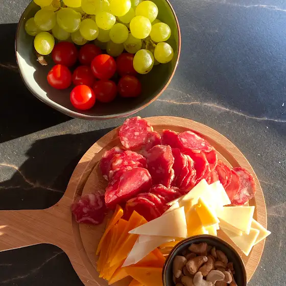Ужин: вот такая полянка на двоих (два вида сыра, сыро копченая колбаса Киндюк, орешки я не ела, виноград и черри). За кадром осталось мороженое лакомка и 🍷