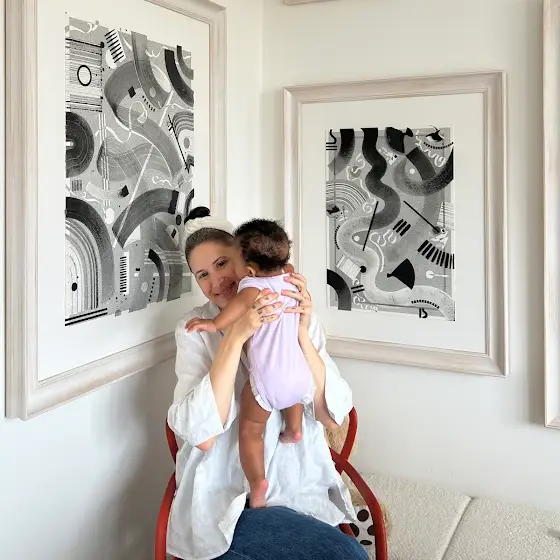 Saying goodbye is never easy, but knowing that my art will be so loved in its new forever home warms my heart. Incredibly happy to send off “The World Behind Her Eyes” (pictured on the left) to its collector in Canada. Sharing one of the last photos with this piece with our 6-month old babygirl Alba, who has loved this artwork since she was just a few days old, to remember and say farewell.