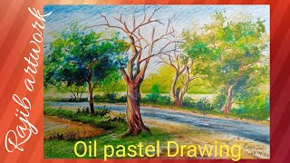 How to draw beautiful nature scenery with village girl figure, Oil pastel color drawing step by step
