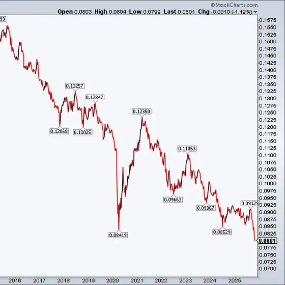 🔹 The equal-weight Consumer Discretionary ETF, $RSPD, is now testing levels not seen since the 2008 crisis relative to the $SPY