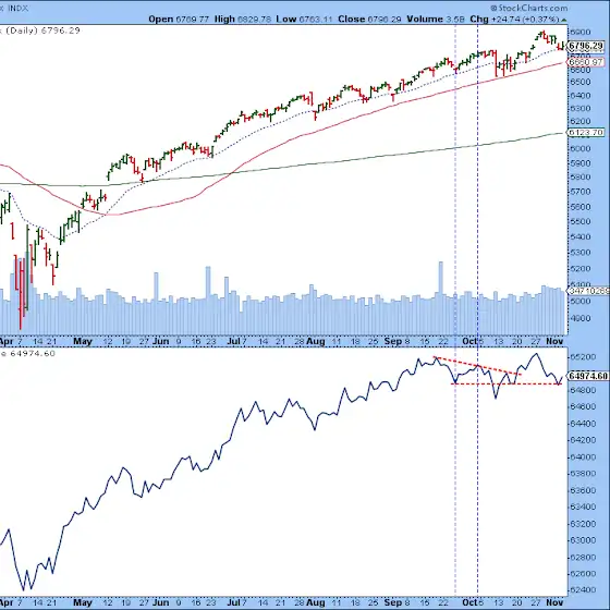 🔹 Meanwhile, the Advance-Decline Line (A/D Line) has kept pace with the S&P. Two weak breadth days recently pulled it back momentarily, but it’s since bounced and remains in trend.