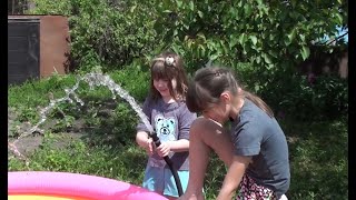 Вика с сестрой устанавливают бассейн в деревне