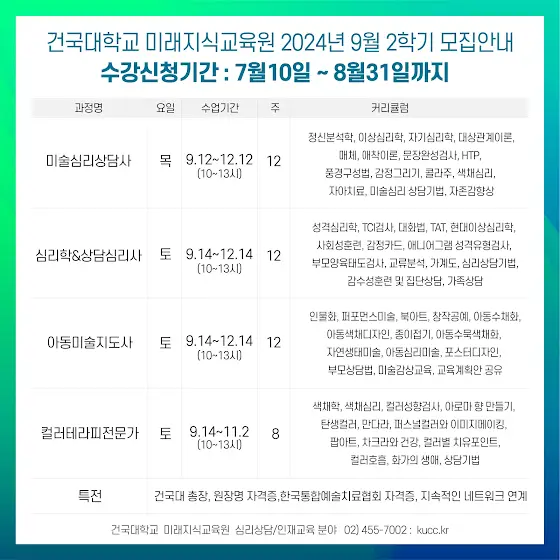 [미술심리상담사 과정] 건국대 미래지식교육원 2024년 2학기 과정안내입니다😀 탄탄하게 구성된 과정들을 건국대 미래지식교육원 심리상담/인재교육분야에서 자격증 공부하고 취득하세요! * 일정: 9/12(목)~12/12(목), 12주과정 * 시간: 10:00~13:00 * 수강신청기간: 7/10(수)~8/31(토) * 접수방법 1) '건대 심리상담/인재교육' 홈페이지 오른쪽 퀵메뉴 '수강신청' 클릭 2) 페이지 하단 '건국대 수강신청 바로가기' 클릭 수강신청 kucc.kr/ 블로그 blog.naver.com/kucckr 전화문의 02-455-7002