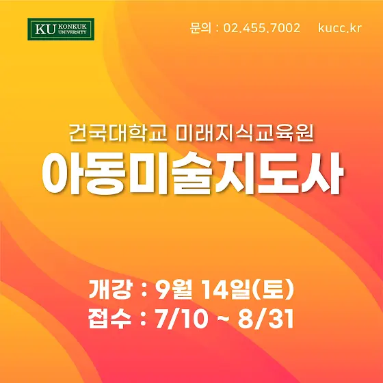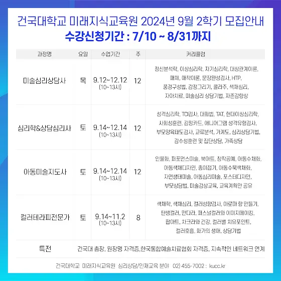 [아동미술지도사 과정] 건국대 미래지식교육원 심리상담/인재교육분야 2024년 2학기 과정안내 입니다😀 탄탄하게 구성된 과정들을 건국대 미래지식교육원 심리상담/인재교육분야 에서 자격증 공부하고 취득하세요~!! * 일정: 9/14(토)~12/14(토), 12주과정 * 시간: 10:00~13:00 * 수강신청기간: 7/10(수)~8/31(토) * 접수방법 1) '건대 심리상담/인재교육' 홈페이지 오른쪽 퀵메뉴 '수강신청' 클릭 2) 페이지 하단 '건국대 수강신청 바로가기' 클릭 수강신청 kucc.kr/ 블로그 blog.naver.com/kucckr 전화문의: 02-455-7002