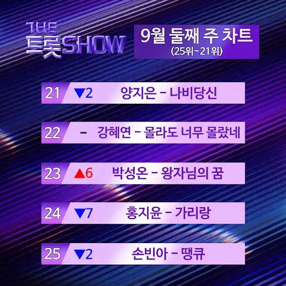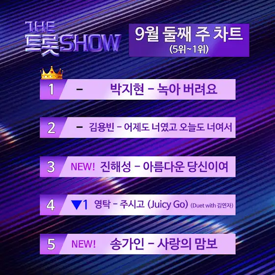 【☑️ 더트롯쇼 9월 둘째 주 차트】25위부터 1위까지 순위를 공개합니다! 🎉 여러분의 최애곡은 무엇인가요? ►더 트롯쇼 명예의 전당 박지현, 녹아 버려요 https://youtu.be/vK23IUu_cX4►THE 트롯차트 BEST 10 노래 듣기 www.youtube.com/playlist?list...