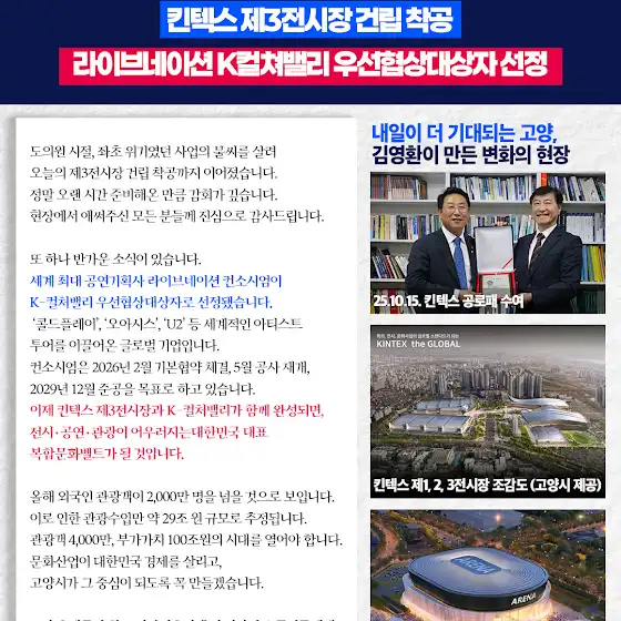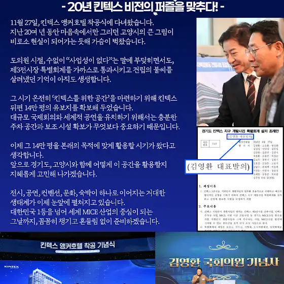 킨텍스 앵커호텔 착공식에 다녀왔습니다. 지난 20여 년 동안 마음속에서만 그리던 고양시의 큰 그림이 비로소 현실이 되어가는 듯해 가슴이 벅찼습니다. 도의원 시절, 수없이 “사업성이 없다”는 말에 부딪히면서도, 제3전시장 특별회계를 가까스로 통과시키고 건립의 불씨를 살려냈던 기억이 아직도 생생합니다. 그 시기 온전히 ‘킨텍스를 위한 공간’을 마련하기 위해 킨텍스 뒤편 14만 평의 유보지를 확보해두었습니다. 대규모 국제회의와 세계적 공연을 유치하기 위해서는 충분한 주차공간과 보조시설 확보가 무엇보다 중요하기 때문입니다. 이제 그 14만 평을 본래의 목적에 맞게 활용할 시기가 왔다고 생각합니다. 앞으로 경기도, 고양시와 함께 어떻게 이 공간을 가장 현명하게 활용할지 지혜롭게 고민해 나가겠습니다. 전시, 공연, 컨벤션, 문화, 숙박이 하나로 이어지는 거대한 생태계가 이제 눈앞에 펼쳐지고 있습니다. 대한민국 1등을 넘어 세계 MICE 산업의 중심이 되는 그날까지, 꼼꼼히 챙기고 흔들림 없이 준비하겠습니다.