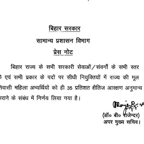 अब सिर्फ बिहार के महिलाओ के लिए 35% आरक्षण।