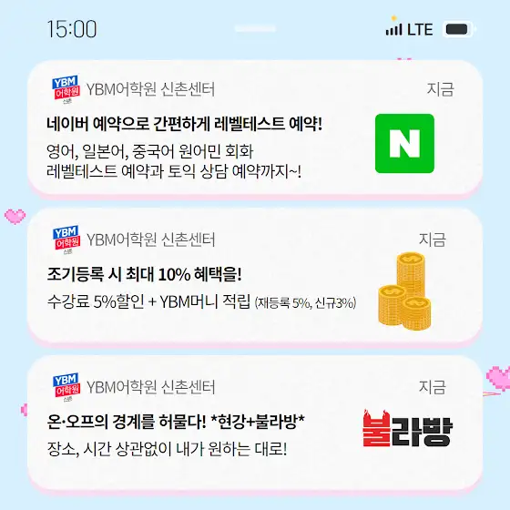 [YBM어학원 신촌센터] 10월 조기등록 혜택 종료임박! D-1✅🎉 조기등록기간 : 9/13(금) ~ 9/20(금)✔️ 수강료 5% 할인+YBM머니 최대 적립 3%)📆10월 개강일 : 10/2(수)