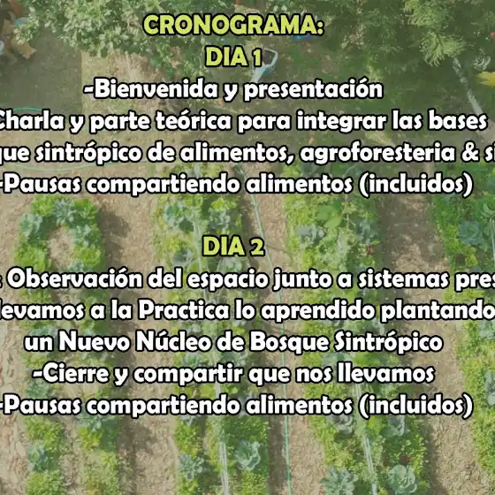 Nos encontraremos para compartir y aprender juntos sobre cocrear abundancia con la tierra mediante herramientas como la agroforesteria, la sintropía y los bosques de alimento. Vamos a estar pasando de la teoría hasta la práctica, con un primer dia de intercambios en modo charla y un segundo dia de implantación de un nuevo bosque sintropico de alimentos, disfrutando del proceso de esta escultura viva la cual se va plasmar 🌿