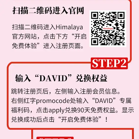 PC端的话,大家进入官网注册的时候在屏幕右下角“优惠码”的位置输入“David”就可以了,不过如果是点连接进去的应该都是输入好的哈~谢谢大家1. 点击链接 www.himalaya.com/mPmbH 2. 点击下方 “开启免费体验” 进入注册页面 3. Promocode处输入 ”DAVID" ,并输入信息,即可领取90天免费畅听服务! (可随时退订,且90天内完全免费!)还请大家帮David个忙,注册一个账号,免费90天会员用起来~。 如果不喜欢,也可以随时退订,只要是在90天内也不会收费。