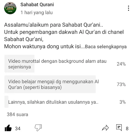 Sebelumnya mimin sampaikan terima kasih untuk teman2 yang sudah menjawab poling kemarin. Mimin menyimpulkan, ternyata teman2 banyak yang menginginkan video belajar mengaji menggunakan mushaf Al Qur'an. Jadi InsyaAllah mimin sudah buatkan videonya. Tapi untuk video murottal dengan background alam, InsyaAllah sesekali mimin buatkan juga he.. Stay tune terus ya di chanel kesayangan kita @SahabatQurani 😊🥰