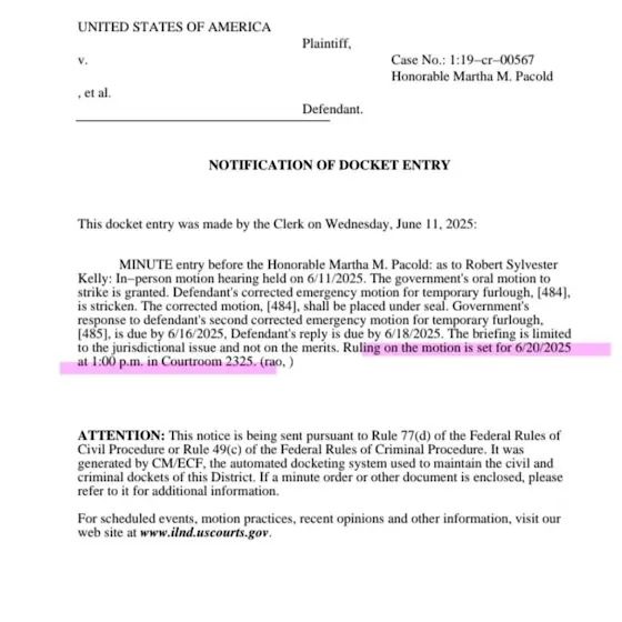 Ruling on the motion for R's release on house arrest is set for 6/20/25 at 1:00pm in courtroom 2325.