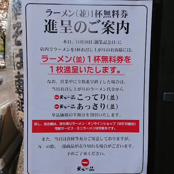 創業記念日の本日、天一でラーメンを食べると、「ラーメン(並)1杯無料券」が手に入りますよー✨