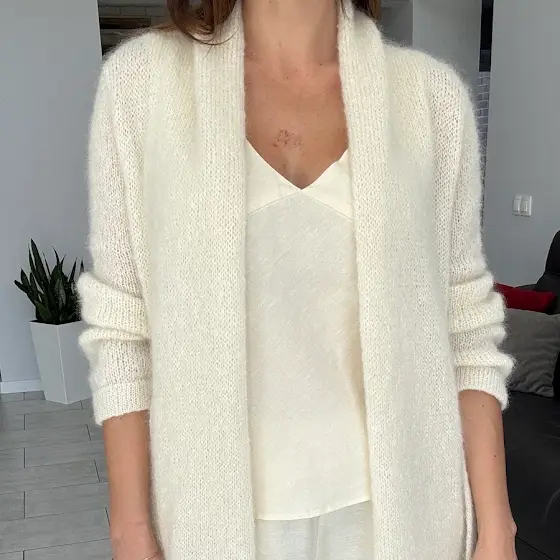 Видеообзор модели здесь: Кардиган-халат спицами Нега - японское плечо, сверху вниз, без швов, эталонная обработка.