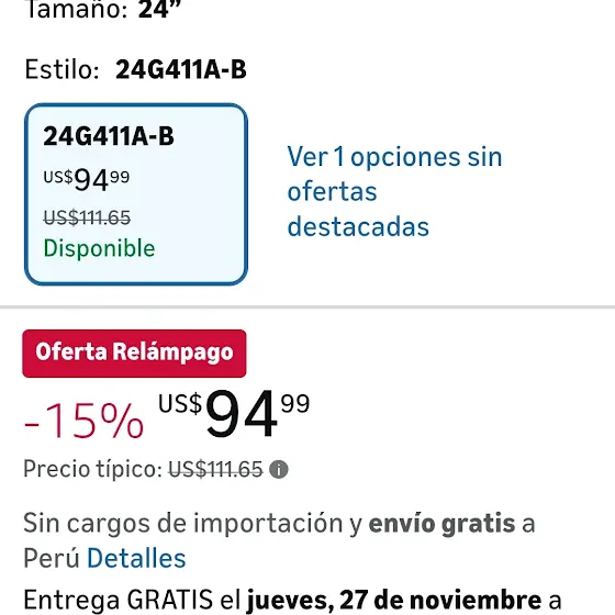 Gente! Si están buscando un monitor económico con buenas especifiaciones esta oferta eatá muy buena. Este LG Ultragear de 24" 1080p panel IPS y 144hz está a $94.99 con envío gratis a Perú.