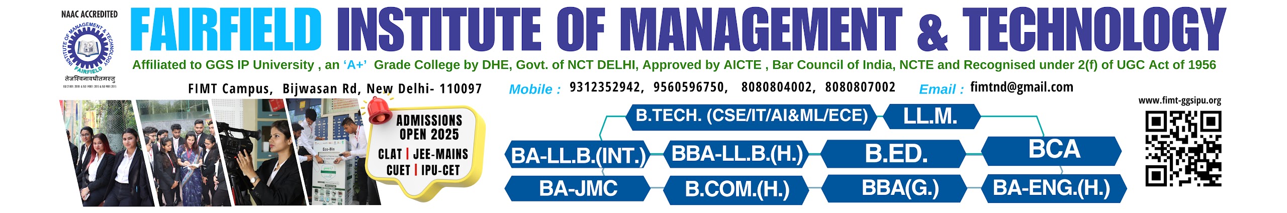 FIMT offers B.TECH. (CSE/IT/AI&ML/ECE) , BA-LLB(Int.) ,BBA-LLB(Hons.), B.Com.(H.), BA(JMC), B.Ed., BCA, BBA(GEN.) , BA-Eng(H), LL.M. courses.