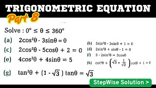 P8 Solve: a) 2cos^2θ-3sinθ=0 b) 2sin^2θ-3sinθ+1=0 c) 2cos^2θ-5cosθ+2=0 Trigonometric Equation #maths