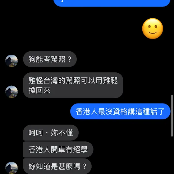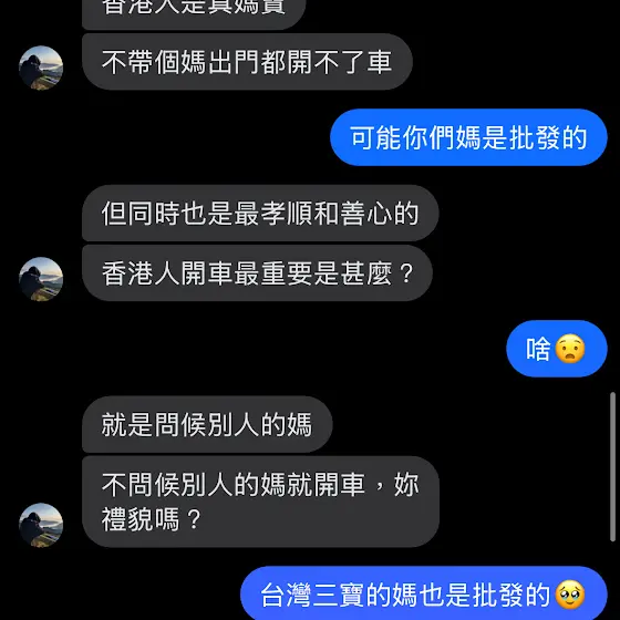 助理:想想看,妳開車時對面香港人問候妳媽媽。