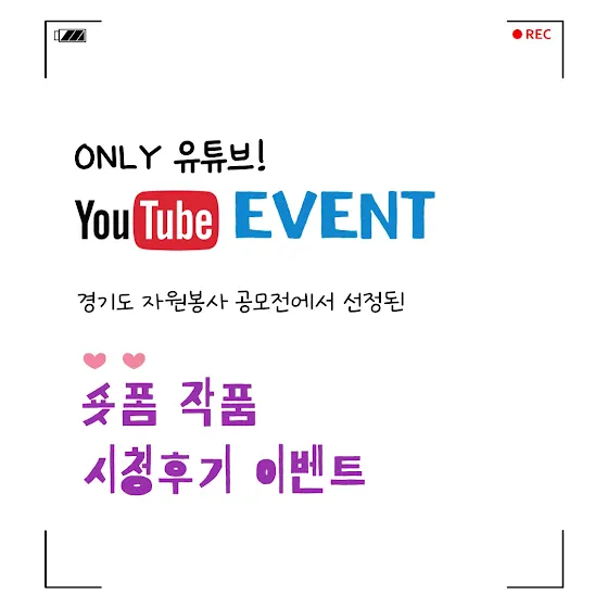 ★ 경자봉 유튜브 한정 이벤트! ★1. 경기도자원봉사센터 채널 구독하기2. 업로드 된 공모전 수상작품(숏폼)에 시청후기&응원 댓글 작성하기▶️8.4.(월) 대상 / 8.5.(화) 최우수상▶️8.11.(월) 우수상 / 8.12.(화) 우수상▶️8.18.(월) 우수상 / 8.19.(화) 우수상3. 구글폼 제출하면 참여 끝!- 참여기간 : 8.4.(월)~8.24.(일)- 구글폼 링크▶️ 유튜브 프로필 상단 링크 클릭 후<시청후기 이벤트> 구글폼 제출- 당첨인원 : 구글폼 제출 인원 중 150명- 결과발표 : 8.28.(목) 개별 문자 발송