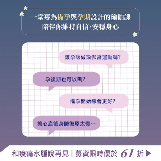 孕育新生命的旅途上有許多旁人無法分擔的辛苦與壓力,瑜伽可以釋放身體上的緊繃痠痛,並帶領我們覺察內在的聲音,讓可能變得凌亂、忙碌的生活拉回平衡。