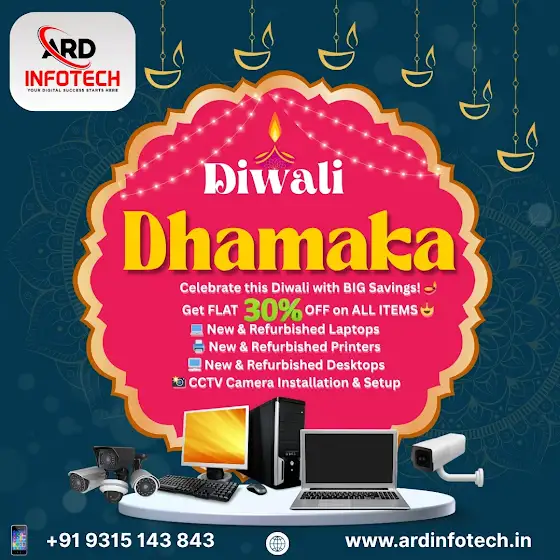 #DiwaliDhamaka #DiwaliOffers #TechSale #RefurbishedLaptops #RefurbishedPrinters #ARDInfotech #BigSavings #CCTVSetup #DiwaliDeals #DiwaliDiscount #LaptopOffers #PrinterDeals #DesktopSale #FestiveOffer