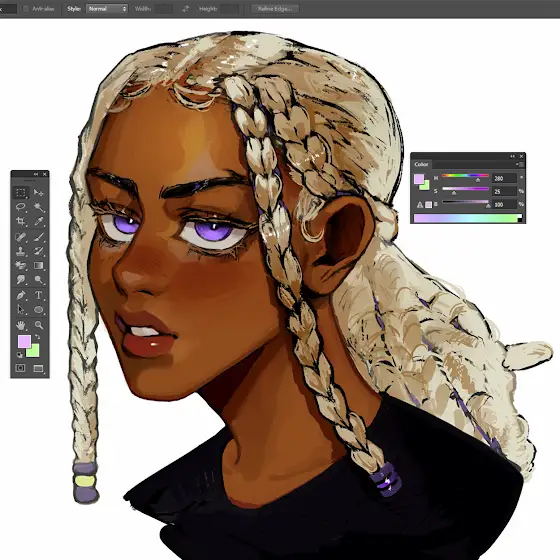 I dialed the saturation of the colours all the way up and added in some really strong green and purple accents to make it pop more! I think that adding in some more halftone dots really helped give it more of a comic bookish style.