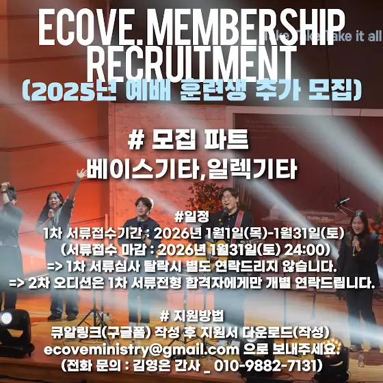 #이커브2025년멤버오디션 #추가모집 #일렉기타 #베이스기타 #이터널커버넌트워십미니스트리예배훈련생모집 #이커브2025년멤버추가오디션