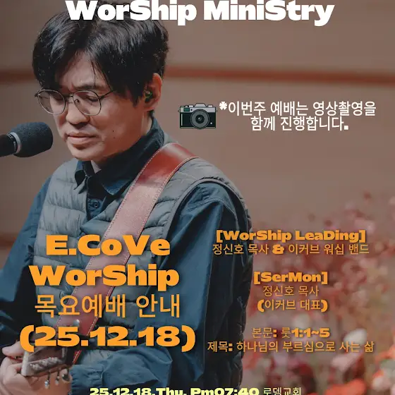 1.2025년 12월 18일 이커브 목요 예배는 로뎀교회(서울 강서구)에서 온라인과 오프라인(대면예배)을 병행하여 드려졌습니다. (예배는 저녁 7시40분에 시작됩니다.)