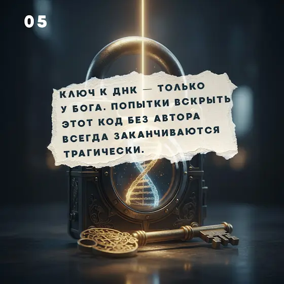 Ключ к ДНК-коду человека есть только у Бога. Самовольные попытки ученых расшифровать этот год, чтобы самостоятельно, без Автора, управлять им нарушают авторские права и всегда приводят к плачевным результатам.