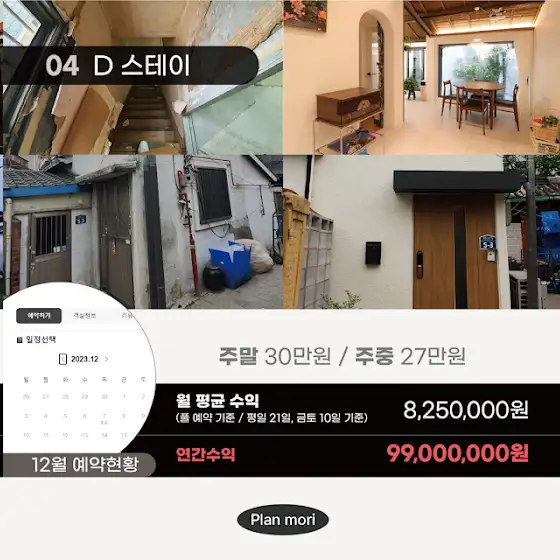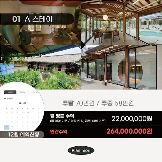 기존에는 대지의 가치만 인정 받고 건물의 가치는 없었던 곳들도 공사를 통해 건물 가치를 높히고 공유숙박으로 운영 하시다가 차후 양도 하실 때에 공사비 만큼의 차액을 높혀서 매도를 하실 수도 있습니다.
