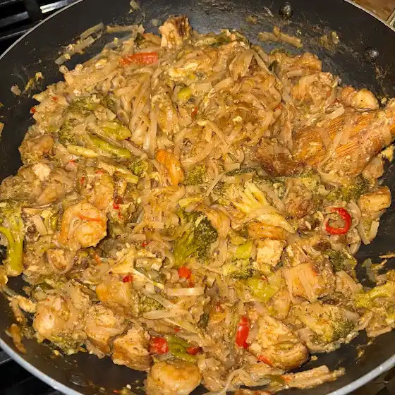 PAD THAI WITH SHRIMP, CHICKEN, & BROCCOLI ON A SATURDAY NIGHT