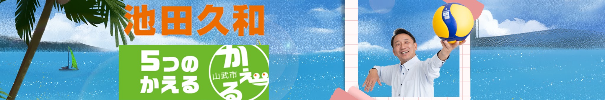 魅力的な山武市へかえる!池田久和は五つの「かえる」をキャッチコピーに、市政の立場から山武市をかえてゆきます。