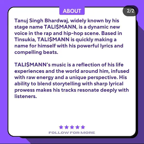 TALI$MANN IS A RAPPER/LYRICIST FROM TINSUKIA, ASSAM ( INDIA) MAKING MUSIC TO EXPRESS HIS FEELINGS, DEFINIG THE STREET STRUGGLES AND TRYING TO ADDRESS SOCIAL ISSUES WITH AN AIM OF PUTTING HIS CITY UP TOP ON THE HIP-HOP MAP.