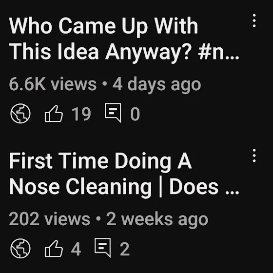I'm also experimenting with Shorts. I thought I'd made a short out of videos I've uploaded and maybe that can entice people to watch the whole video. I tried that with my latest video where I do a nasal cleaning and... apparently that hasn't happened.
