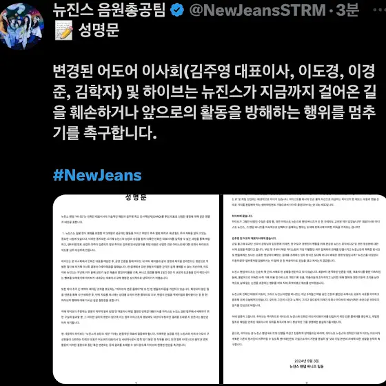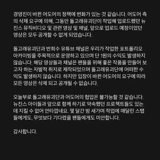 정말 안타깝고 저 포함 모든 팬분들,뉴진스를 좋아해주시는 대중분들이 원하던 결과와 달라서 아쉽습니다.