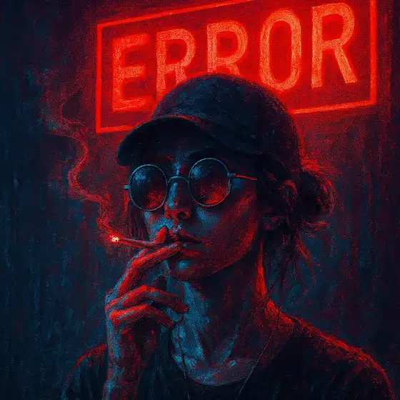 A cyberpunk-style portrait of a [woman/Man] in neon red and blue lighting. [She/He] is wearing round futuristic sunglasses and holding a cigarette near her lips. Her expression is calm and mysterious. The background features a glowing neon sign that reads “ERROR” [Puedes cambiar el mensaje] in bold red letters. The lighting creates a dramatic contrast on her face and clothing, giving the image a gritty, digital-painting look.