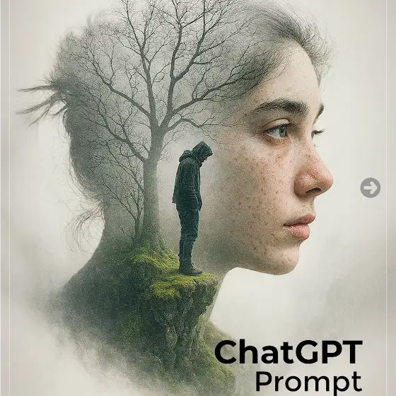 A surreal double exposure digital artwork blending nature and emotion. The primary focus is the detailed side profile of a woman with pale skin, piercing blue eyes, and natural freckles. Her face is seamlessly overlaid with the image of a leafless, intricate tree, its branches spreading through her hair and features, symbolizing growth and introspection. Inside the silhouette of her face, a solitary figure wearing a hooded jacket and dark pants stands thoughtfully on a moss-covered cliff, gazing downward. The background is softly muted in foggy whites and greys, enhancing the dreamlike, reflective atmosphere. The composition evokes themes of solitude, inner journey, and the connection between humanity and nature.