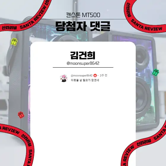안녕하세요, 산타리뷰입니다~! ㅤ 🎁 오늘 어른이들을 위한 산타의 선물! 시선강탈 변신 스피커, 슈퍼노바 블루투스 스피커를 받게 되실 당첨자분들을 공개합니다!