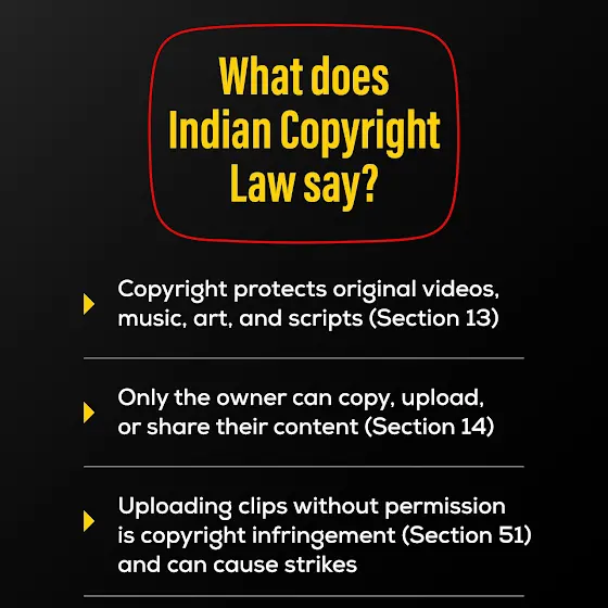 Indian copyright law protects videos, music, and scripts. Even short clips can trigger a strike if not used under fair use.