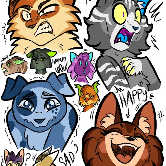 I still struggle with drawing on the tablet, so I decided to draw a bunch of cat faces with different expressions to try to get used to it. β Yes, these characters were created just for this haha-