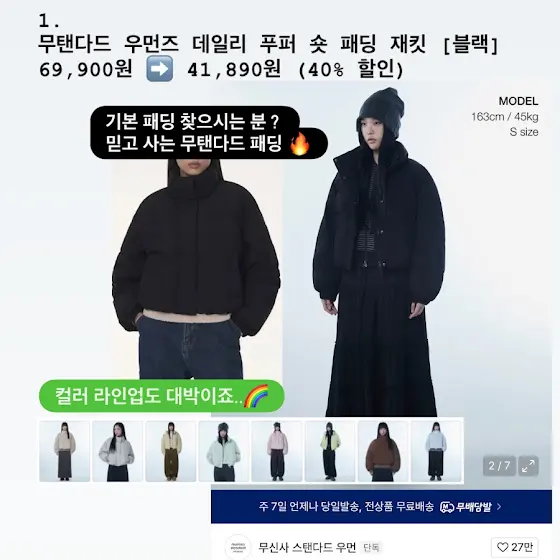 1. 무탠다드 우먼즈 데일리 푸퍼 숏 패딩 재킷 [블랙]