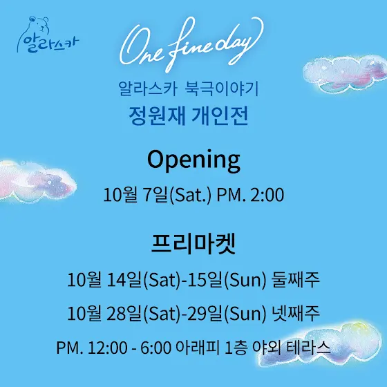 정원재 개인전 <알라스카 북극이야기> 와 함께한 날이 당신의 “어느 멋진 날 One fine day” 가 되길 진심으로 바랍니다.