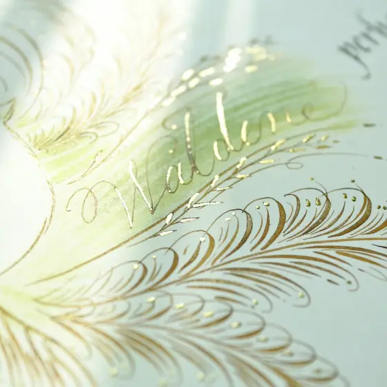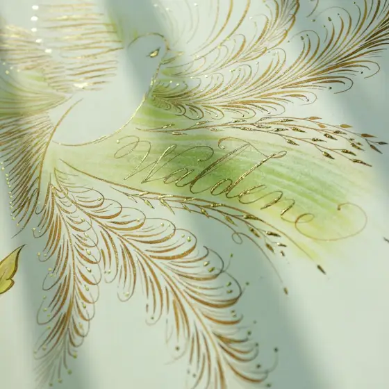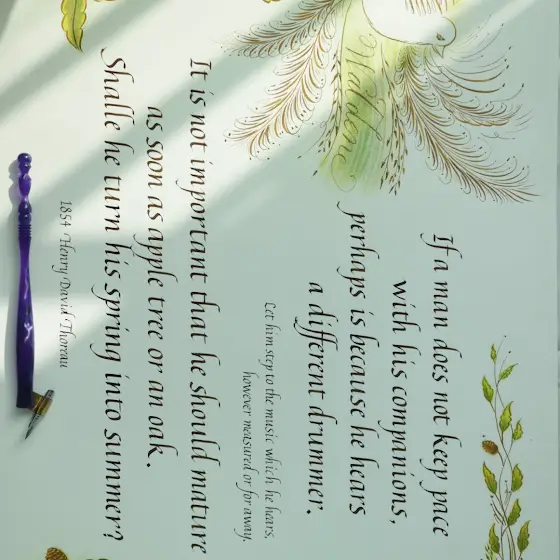 책 월든의 문구를 이탤릭체로 필사하고, 책의 상징인 제비와 떡갈나무(Oak)를 플러리싱 기법으로 그렸습니다.