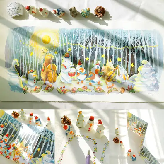 #알라스카#북극이야기 첫, 그림책 완간 기념 실크 스크린으로 만든 한국의 사계절을 담은 원화전입니다. My Favorite Thing 전시에서는 오랫만의 신작 수채화 만날 수 있어요. 북극곰 “두부” 쌍둥이 펭귄 “핑, 퐁“이 전하는 우리나라 사계절의 아름다움과 귀여움의 세계로 초대합니다.