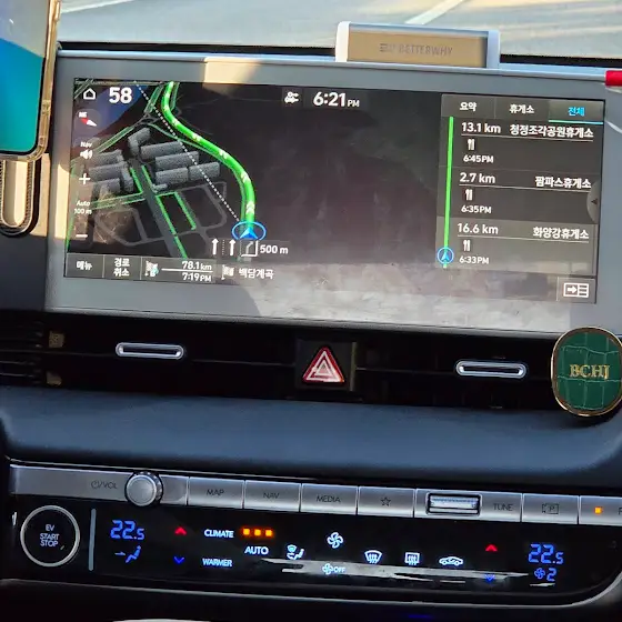 요즘 만충 하면 570km 정도 타네요 실제주행은 에어컨 켜면 530km 정도요. 충전 비용은 16000원정도