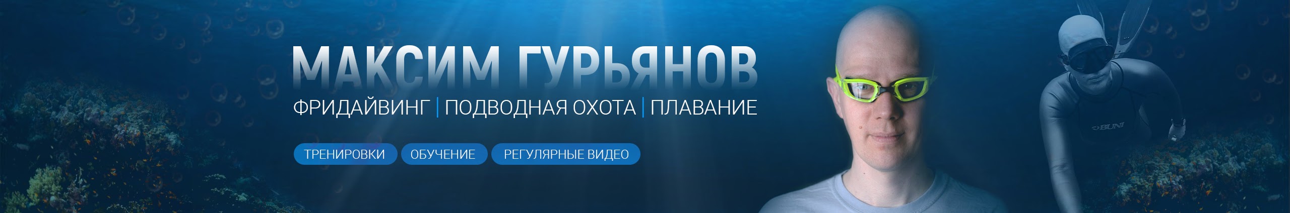 Привет! Я, Максим Гурьянов, профессиональный инструктор по фридайвингу и тренер по плаванию. На этом канале вы найдете много полезной информации о фридайвинге (ныряние на задержке дыхания ) и подводной охоте ( видео, техника, советы). Регулярное видео (раз в неделю), стримы, обучение, полезные советы и конечно же общение и ответы на ваши вопросы.