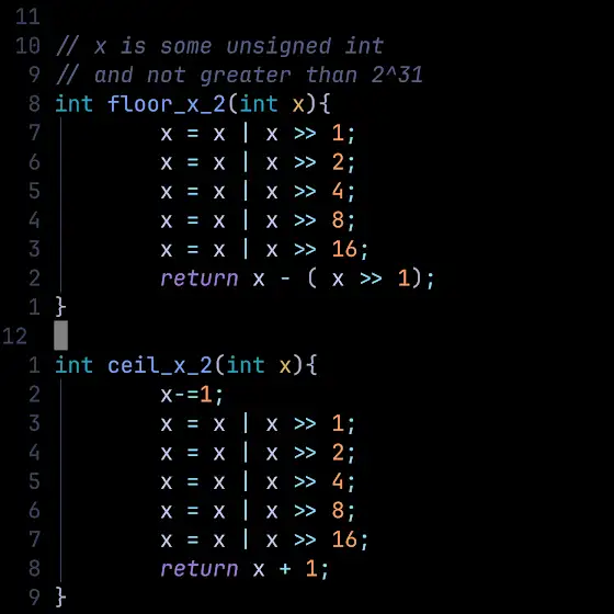 If we have an unsigned int smaller than or equal to 2^31, we can use these constant time functions to find the ceiling and the floor of a number with regard to powers of 2.