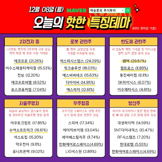 12월12일(금) 특징테마, 특징주 입니다. 더 많은 주식 자료는 '하승훈의 주식투자' 네이버 카페에서 무료로 보실 수 있습니다.😊