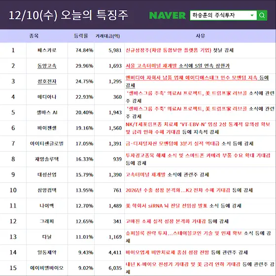 12월10일(수) 특징테마, 특징주 입니다. 더 많은 주식 자료는 '하승훈의 주식투자' 네이버 카페에서 무료로 보실 수 있습니다.😊
