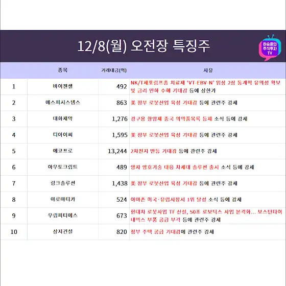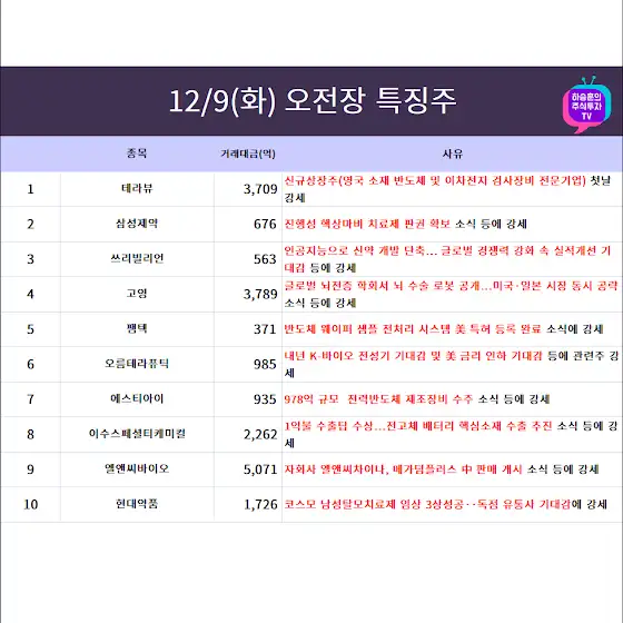 12월10일(수) 오전장 특징테마, 특징주 입니다.😍